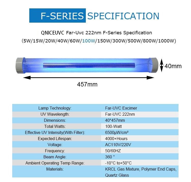 An innovation of FAR-UVC, QNICE 222nm UVC F-Series Excimer Lamps is a mercury free lamp and disinfect 99% of viruses, bacteria,