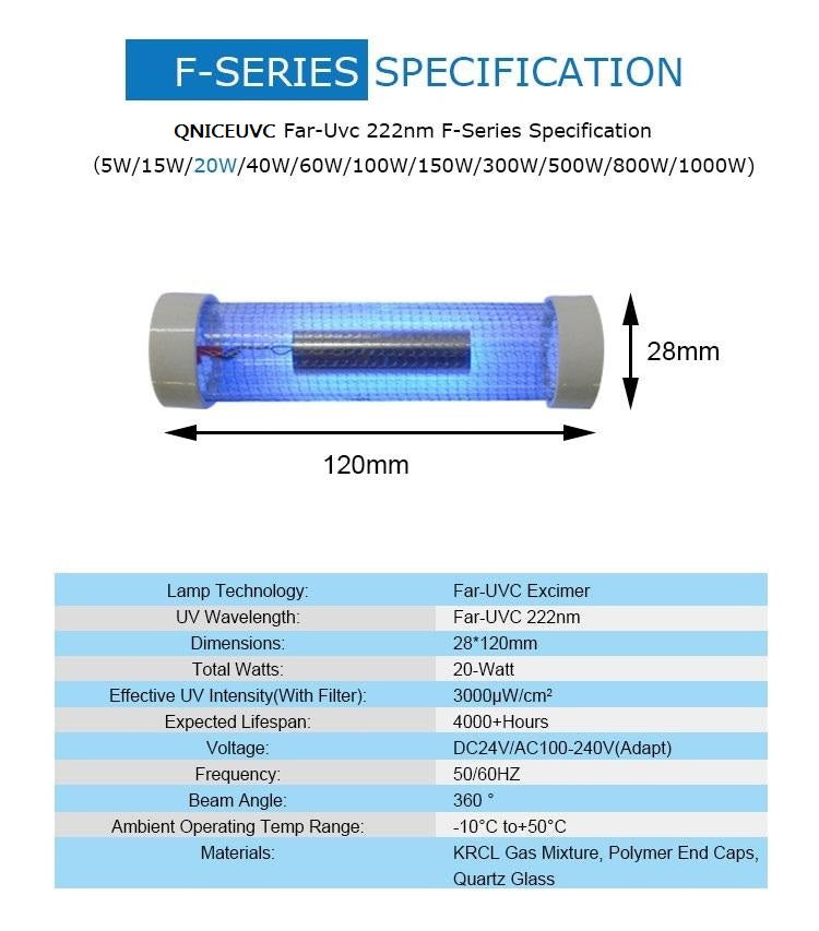 An innovation of FAR-UVC, QNICE 222nm UVC F-Series Excimer Lamps is a mercury free lamp and disinfect 99% of viruses, bacteria,