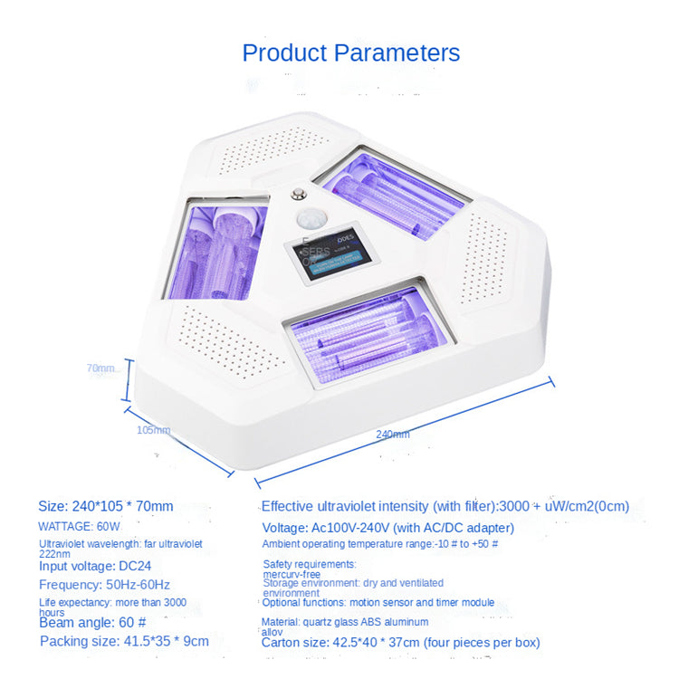 Parameters of Safe 222nm Far UVC Light 60W Triple Disinfection Sterilizer